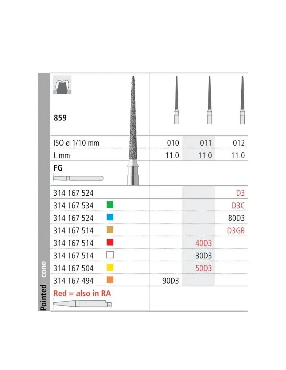 Con forma de lanza cono puntiaguado, la fresa 859-010 es una fresa diamante de grano ultra fino, 8 µm, con marca naranja.