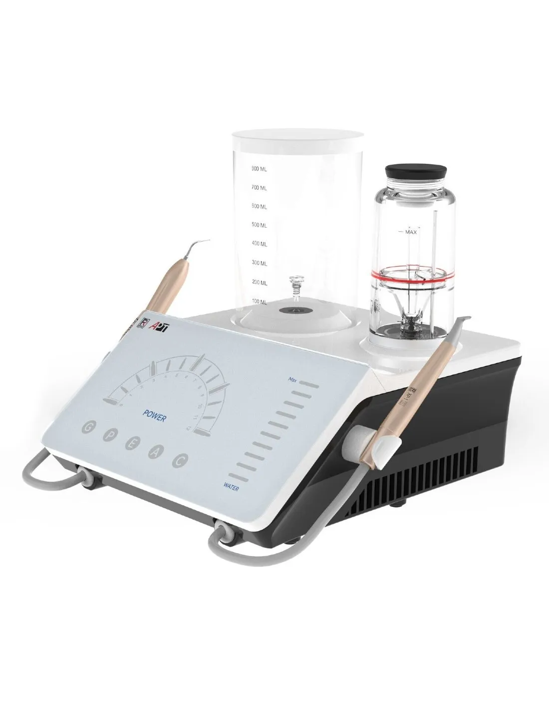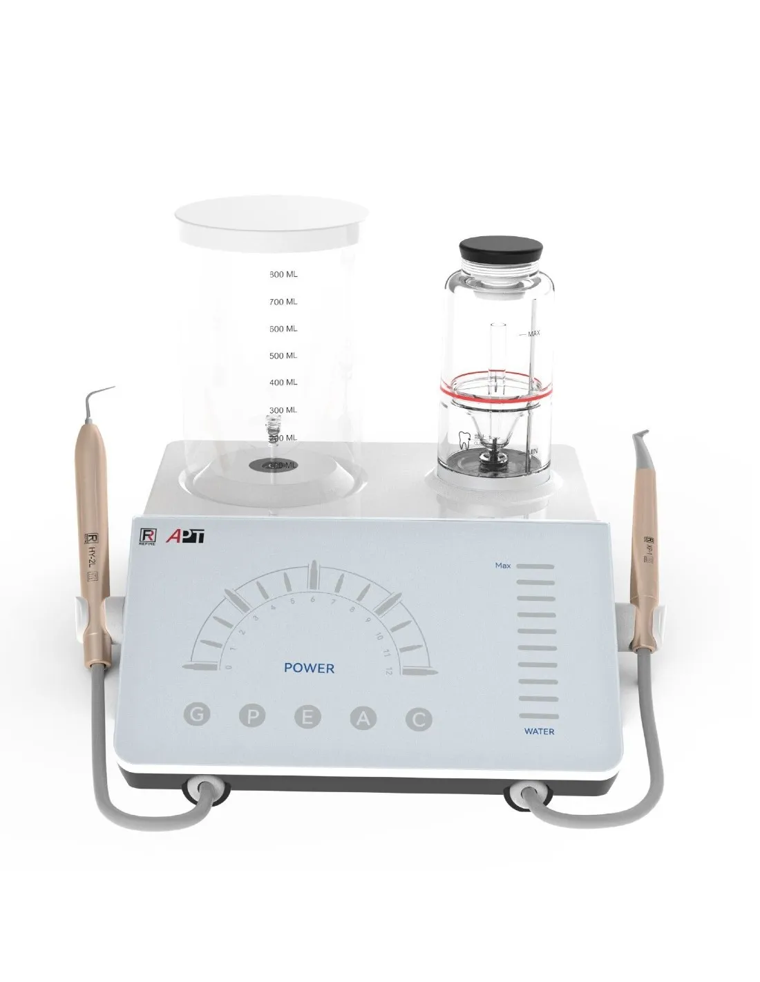 El ultrasonidos piezoeléctrico Refine APT es un dispositivo 2 en 1: sistema de tratamiento periodontal y sistema de pulido Prophy Air Flow.
