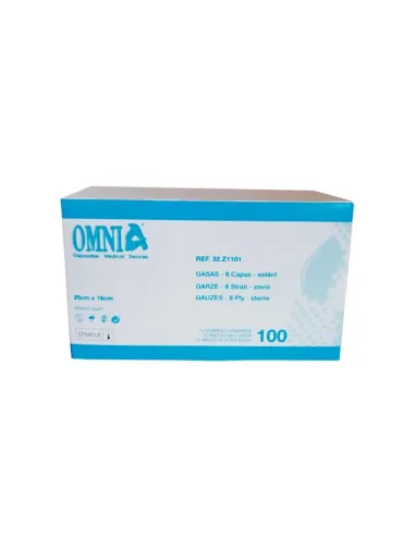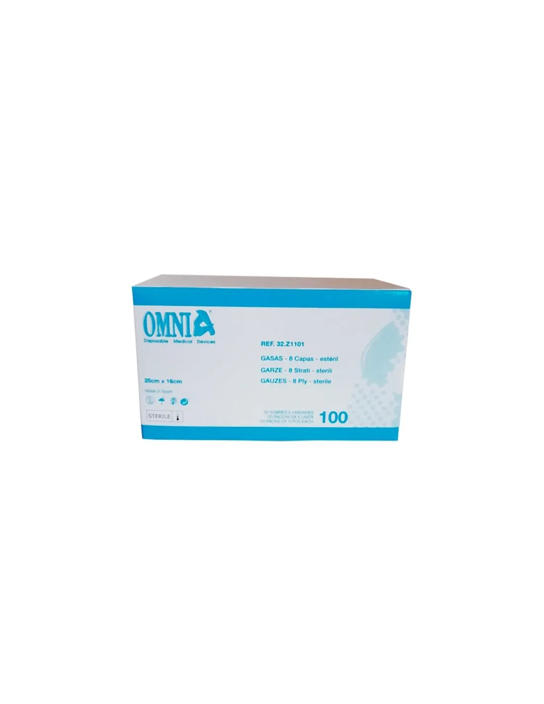 Las gasas estériles 25x16cm de Omnia son fabricadas en algodón 100% hidrófilo rectilíneo y vienen plegadas. El tamaño plegado es 8x6cm.