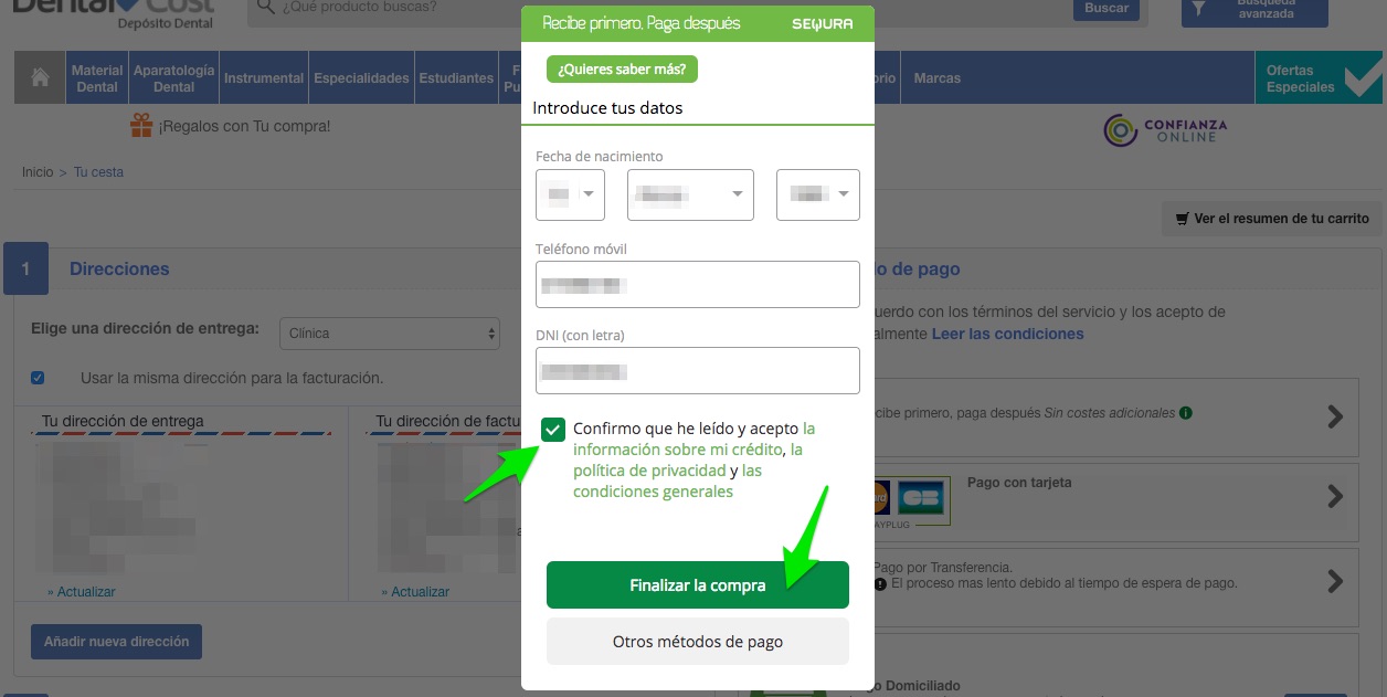 1. Una vez escogidos los productos y comprobado el carrito, haz click en "Confirmar y Pagar". Comprueba tus direcciones de envío y facturación. En métodos de pago, escoge "Recibe primero, paga después" de Sequra.